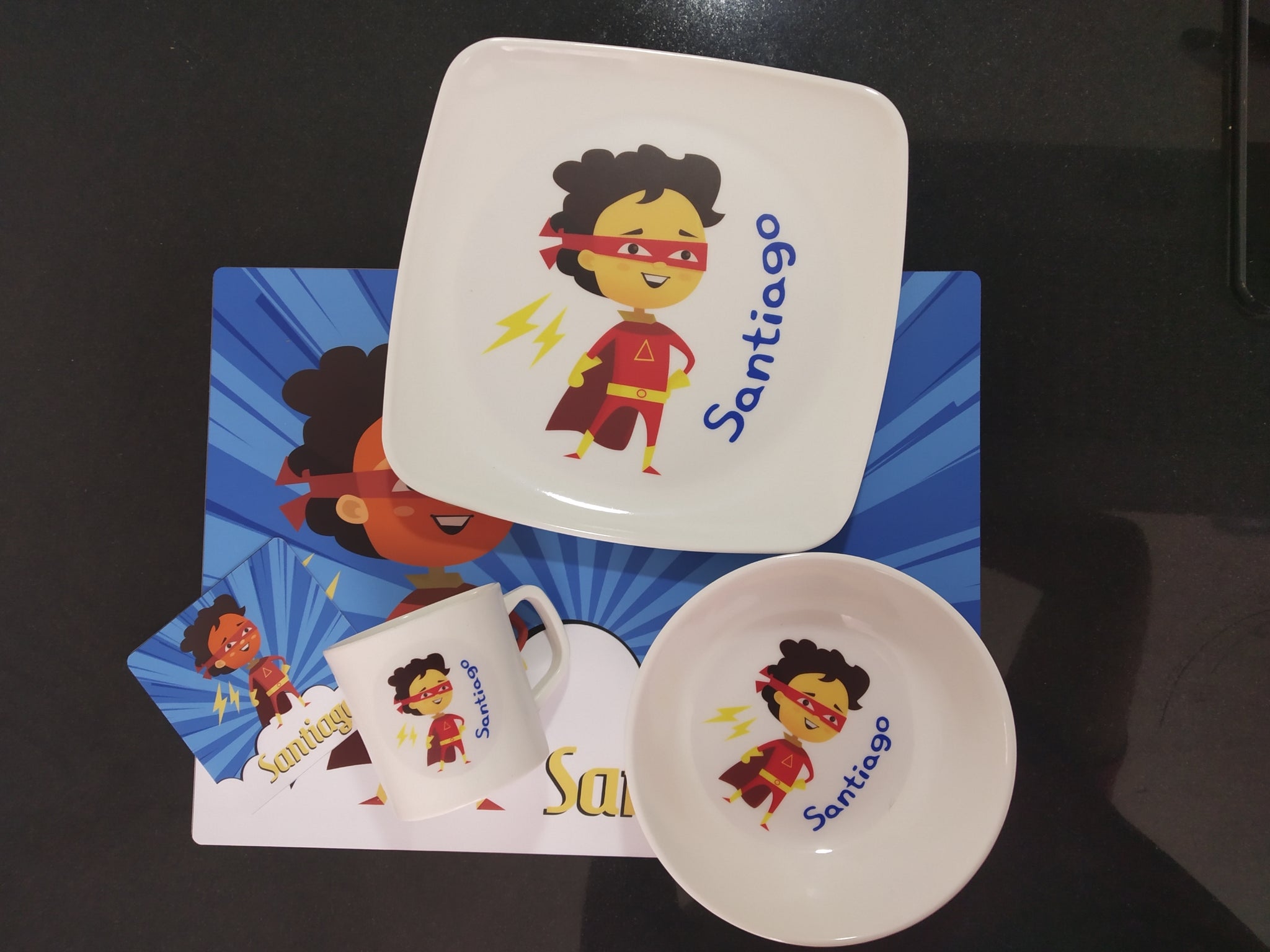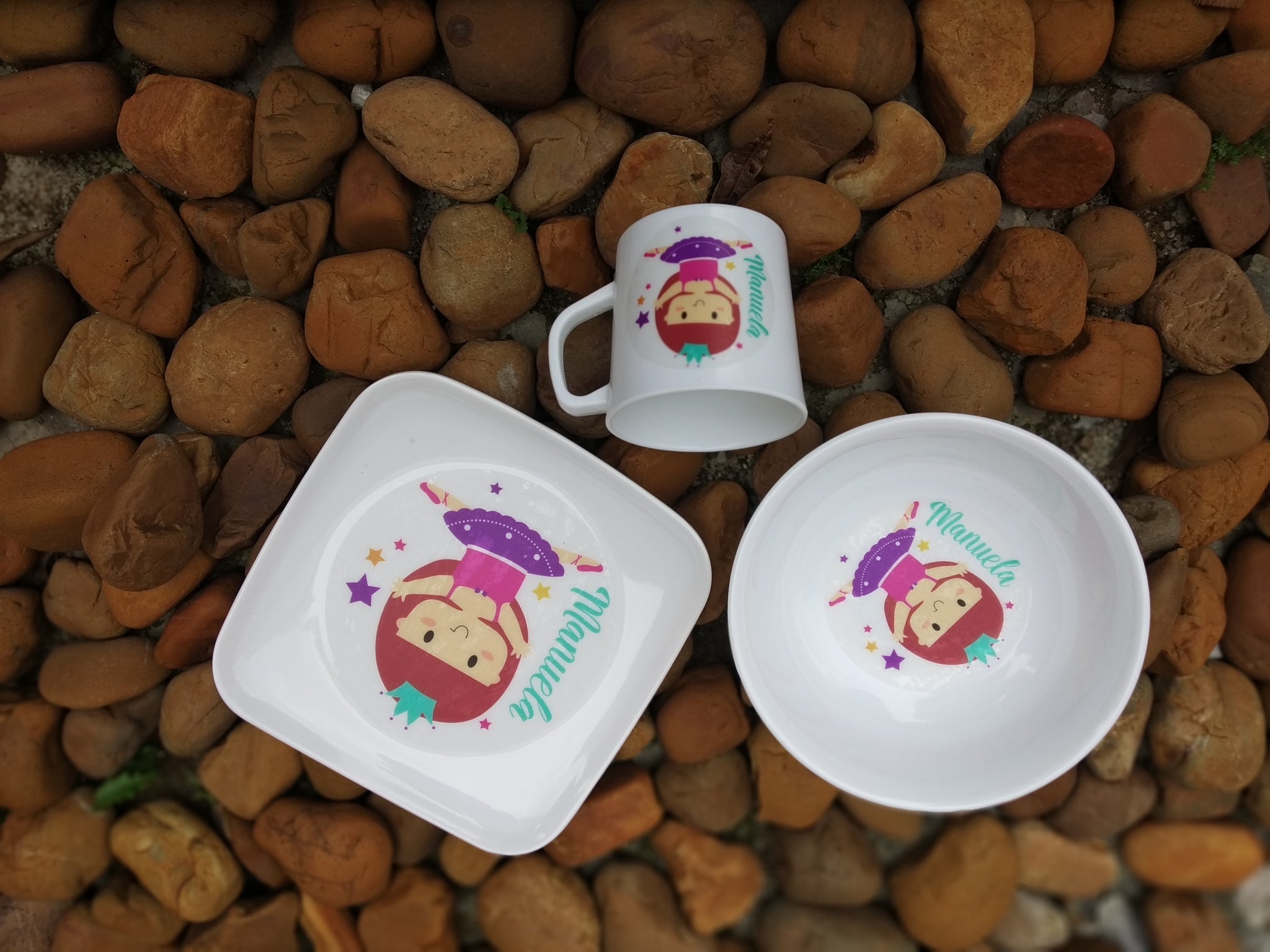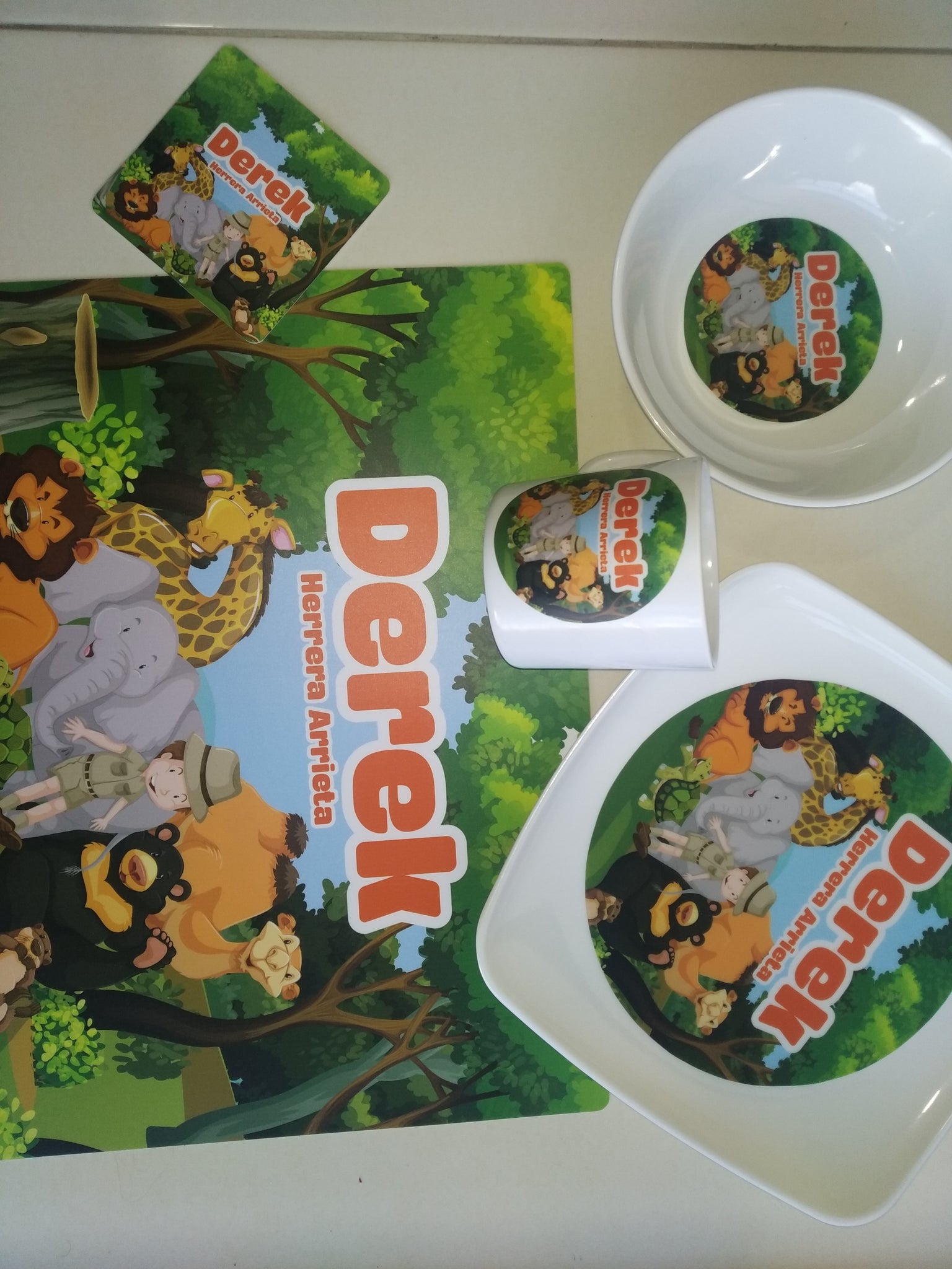 Material: La vajilla es en melamina (La melamina es un compuesto sintético que se utiliza a menudo en vajilla y algunos muebles por su practicidad. Es conocida porque los platos resultan livianos, fáciles de lavar) resistente el calor y los portavasos e individuales en poliestireno calibre 15